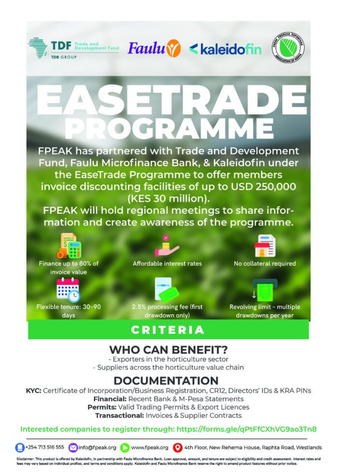 The Fresh Produce Exporters Association of Kenya (FPEAK) has announced a strategic partnership under the EASETRADE Programme, bringing together the Trade and Development Bank Group (TDB Group), Faulu Microfinance Bank, and Kaleidofin Private Limited to unlock new financing opportunities for horticulture businesses.