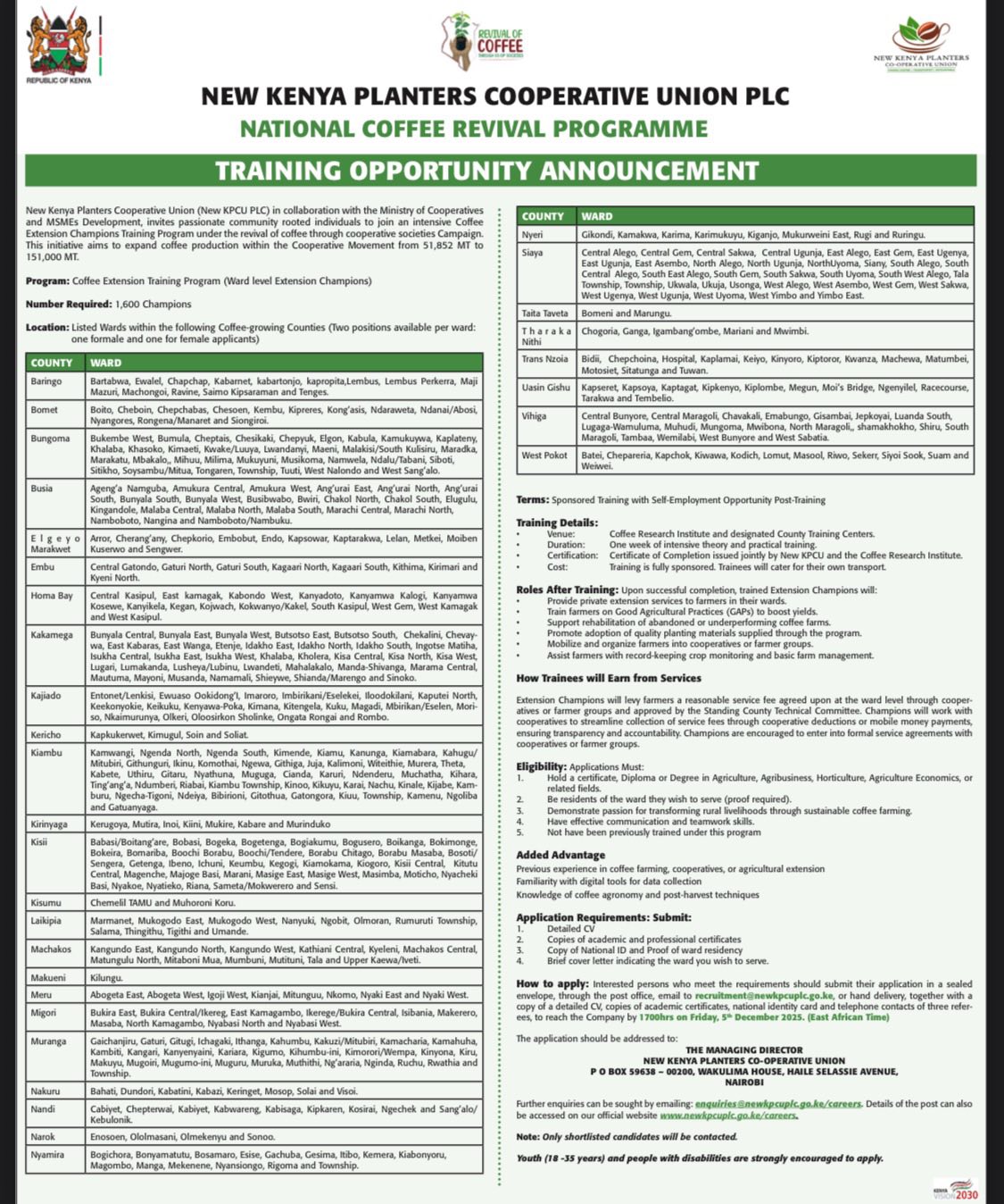 New KPCU is targeting applicants aged 18–35 years, with Persons with Disabilities (PWDs) encouraged to apply. Candidates must hold a Certificate, Diploma, or Degree in Agriculture, Horticulture, Agribusiness, Agricultural Economics, or any related field. Applicants must be residents of the ward they hope to serve and must not have participated in previous intakes under the same programme.