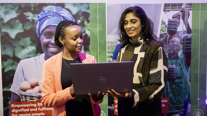Ms Michelle Gathigi (left) the Director of Operations for Spatial Collective Ltd is taken through the application process of the Agribusiness Challenge Fund by the Mastercard Foundation Fund for Resilience and Prosperity Engagement Partner Mrs. Smita Sanghrajka (right) during the launch of the fund.